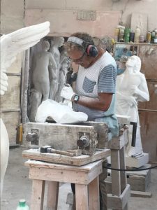 Thuis heb ik een heerlijke werkplek maar ook bij de familie Antognazzi in Pietrasanta Italië heb ik ieder jaar een heerlijke werkplek om me verder te bekwamen in het werken met diverse soorten marmer. Geweldig om daar te mogen werken tussen deze artisani (vakmensen) en generaties beeldhouwhistorie. Ook de vele beeldhouwers die daar werken zijn een enorme stimulans. Als een model/ontwerp naar m’n zin is ben ik niet meer te stuiten, bestaat er geen tijd meer en werk ik toe naar de vorm die ik in gedachten heb. Hakken naar de ruwe vorm en dan eindeloos raspen en schuren om de ideale lijn uit een beeld te halen.